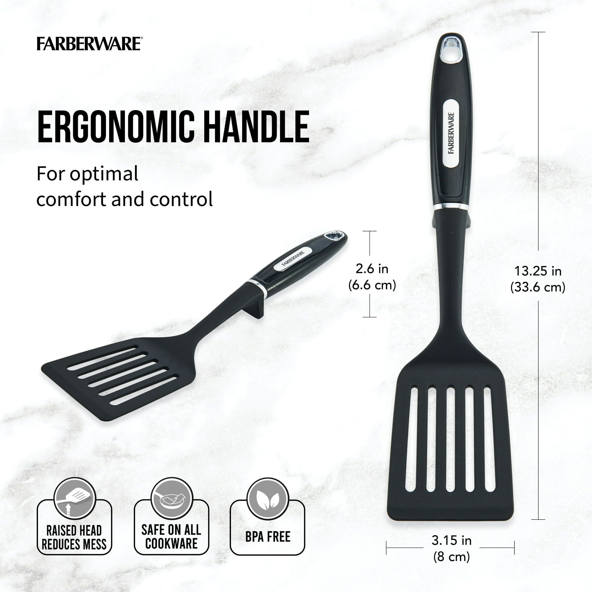 Flip, stir, sauté, and stir fry a variety of foods with the Professional Slotted Turner. The slotted head strains grease and other liquids from food while cooking, and is heat-resistant to 400°F. This versatile turner is made from durable nylon and is safe for use on all cookware, including nonstick. The tip-up feature raises the head when not in use to keep countertops clean. Dishwasher safe. Lifetime Limited Warranty.