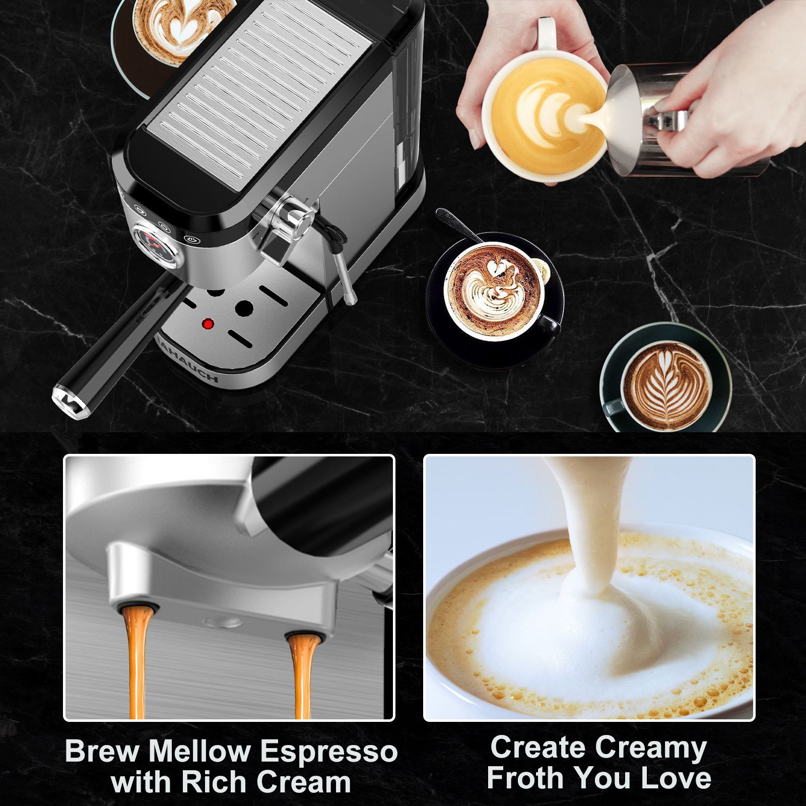 1.Brew Your Favorite Espresso, Start A New Day: IAHAUCH Espresso Machine with 20 Bar Pump & 1350W high performance to penetrate the powder powerfully & evenly, extracting rich CREMA caramel-colored espresso. Wake yourself up with aromatic coffee at home/office.