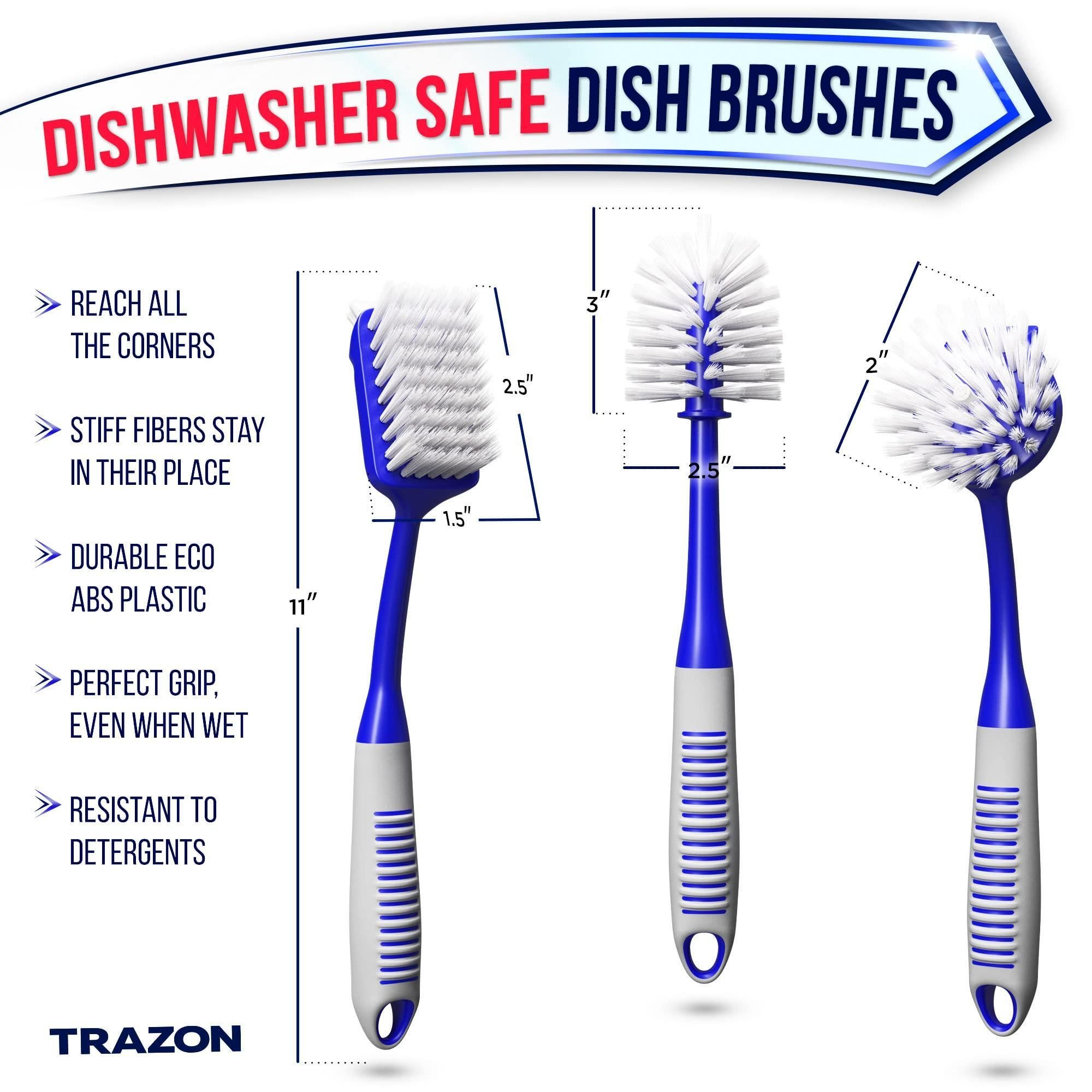 2.Well-Performing Materials. Our bottle brushes for cleaning are made of high-performance eco ABS plastic known for its excellent durability qualities. Every dishbrush handle is covered with rubber that ensures a firm and comfortable grip. The handles have a curved form for more comfortable and effortless dish cleaning. When youre done, you can run dish brushes through the dishwasher to remove food particles as these items are dishwasher-safe
