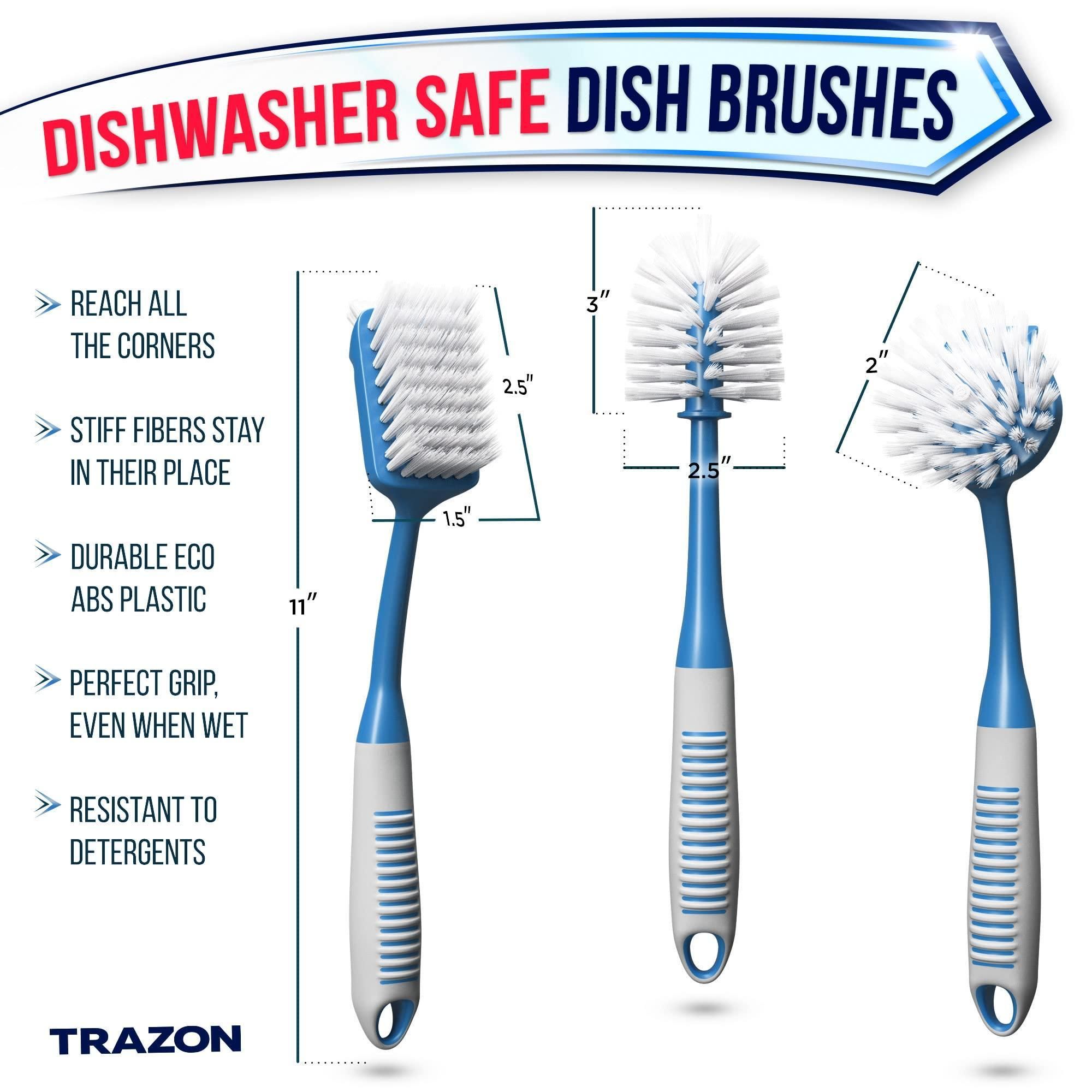 1.well-performing materials. our bottle brushes for cleaning are made of high-performance eco abs plastic known for its excellent durability qualities. every dishbrush handle is covered with rubber that ensures a firm and comfortable grip. the handles have a curved form for more comfortable and effortless dish cleaning. when youre done, you can run dish brushes through the dishwasher to remove food particles as these items are dishwasher-safe