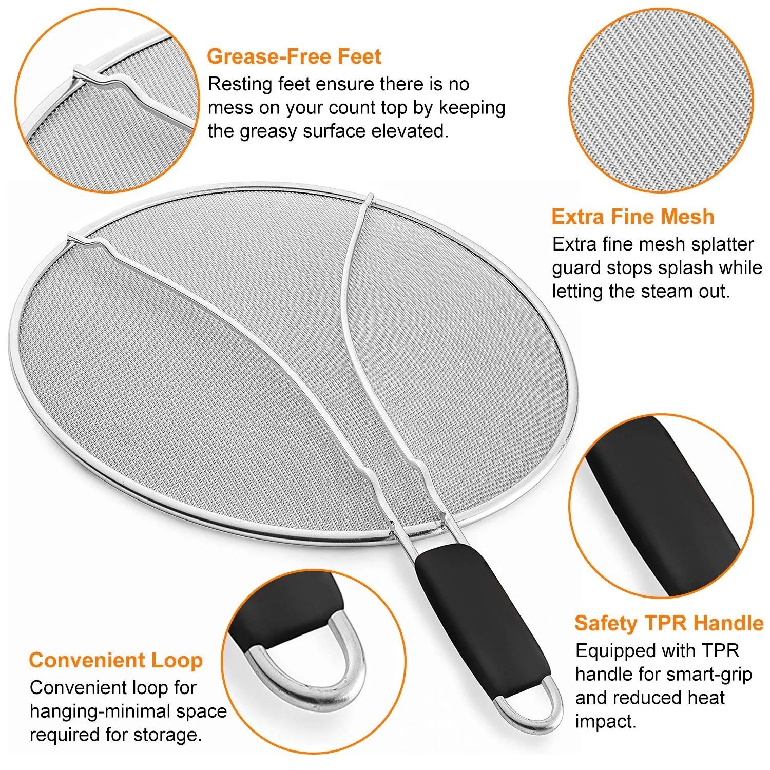 2.Safe Cooking: Improve safe cooking conditions with a splatter shield grease catcher. The fine mesh splatter screen prevents liquid splatter from reaching outside the pan, keeping hot liquid or food fragments where they should be without reaching your clothes or skin.